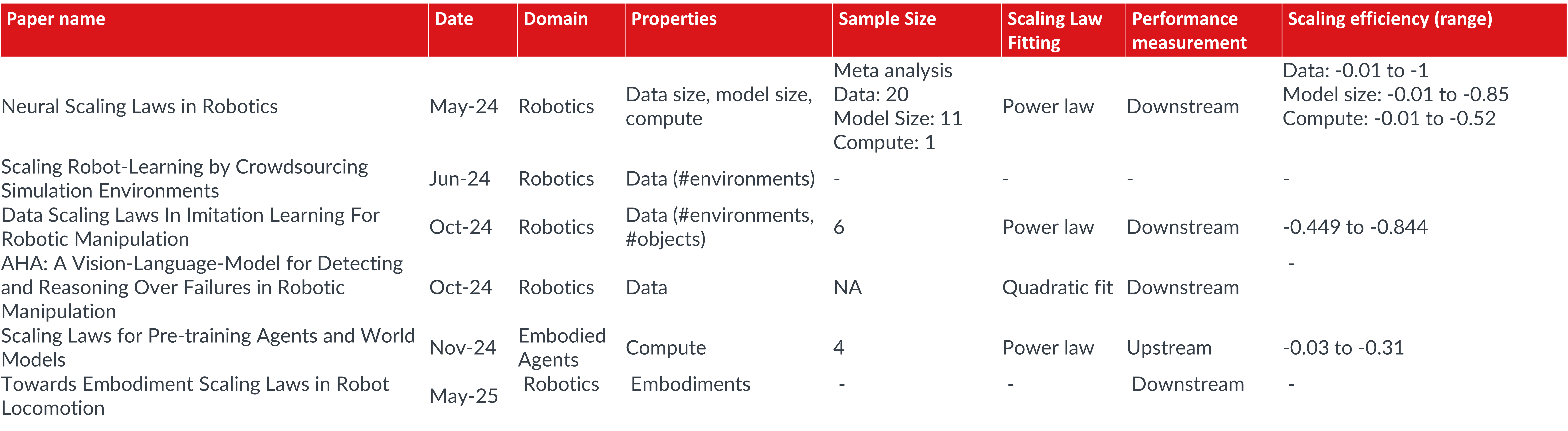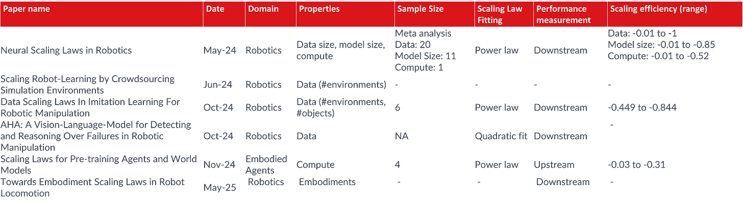In a meta-analysis with 327 papers I performed, only 26 explored data size scaling in any systematic way. Most compared just two sizes, limiting the reliability of conclusions. Even fewer studied compute scaling. Still, for the papers that did quantify scaling laws, performance gains were observed, with scaling exponents for data and model size ranging from -0.01 to as high as -1.0. That’s a wide range, reflecting the diversity of robotics tasks. Some models improve rapidly with scale; others plateau early. In aggregate, we see a median exponent of around -0.217 for data and -0.172 for model size [source]. These numbers are encouraging.